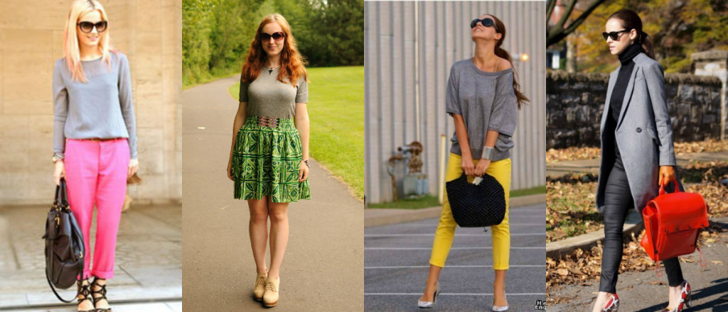 Благодаря своей практичности, серый часто используют при составлении повседневного образа. Оживить его помогут яркие аксессуары. Серое платье будет отлично смотреться с красным тонким поясом, а вместе с серой юбкой можно надеть свитер сиреневого оттенка.