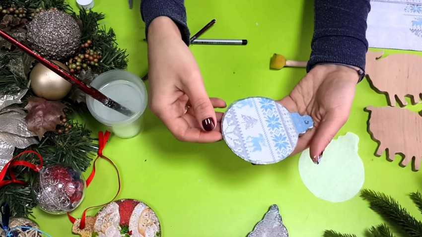 Сейчас для поделок продается много различных заготовок, в том числе и из фанеры. Поэтому можно смастерить вот такие симпатичные новогодние шары. Для их изготовления придется прикупить и другие материалы в магазине для творчества.