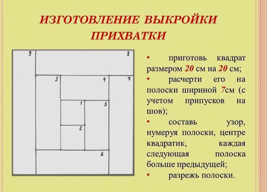 Выкройку для квадратной прихватки совсем не трудно изготовить самостоятельно.