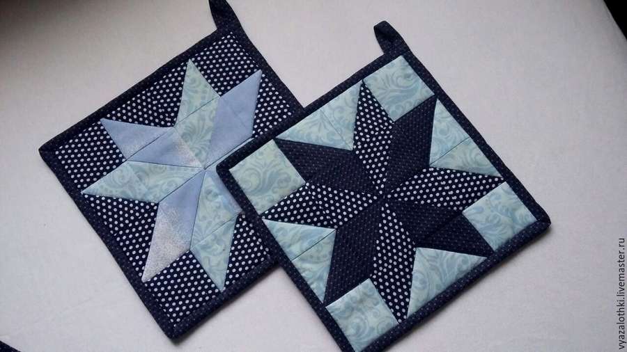 Для таких прихваток нужно иметь терпение и навыки. Но зато результат выходит просто сногсшибательный! Нарезать детали на такие изделия нужно строго по долевой нити, иначе изделие потом деформируется.