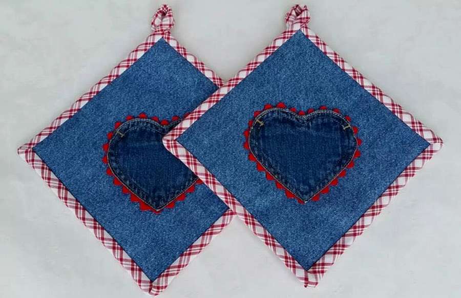 Пример простых квадратных прихваток из джинсовой ткани. Сумев сшить очень аккуратные квадратные прихватки, мастер декорировал их сердечками из той же джинсовой ткани.