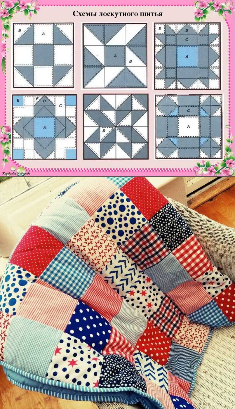 Красота лоскутного одеяла, сделанного своими руками, во многом зависит от продуманной схемы пошива. Определенных правил повторяемости нет, можно использовать как равное количество квадратов каждого вида, так и выбрать некоторые ткани, которые будут повторяться чаще других. Такая свобода позволяет создавать варианты для уже заготовленного материала.