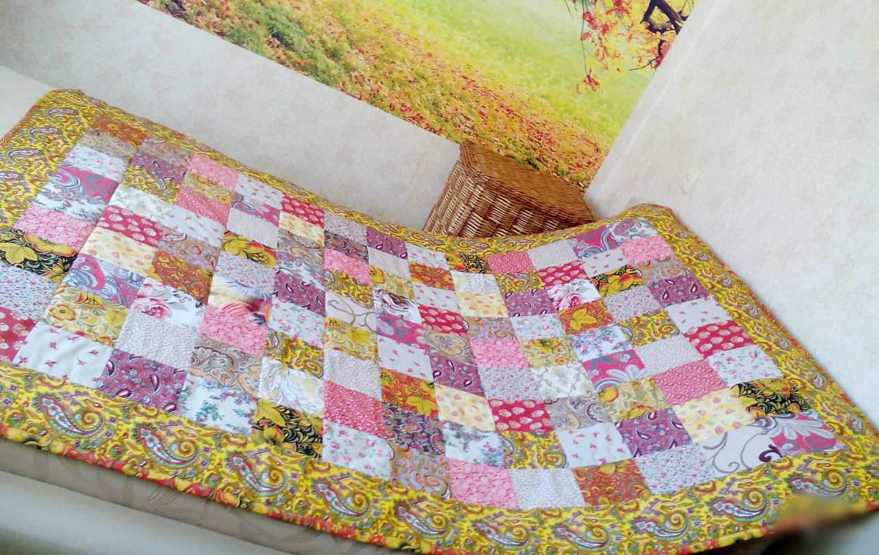 Эффектно смотрится изделие, сшитое из одинаковых чередующихся элементов разного цвета. Можно оформить полотно в виде шахматной доски или букв Х и V. Такой дизайн больше подойдет для взрослых, поэтому выбирайте ткань спокойных оттенков.