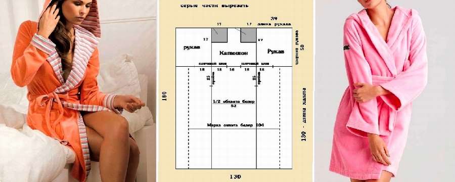 Варианты банных халатов с рукавами и капюшонами из махровой ткани по одной выкройке.