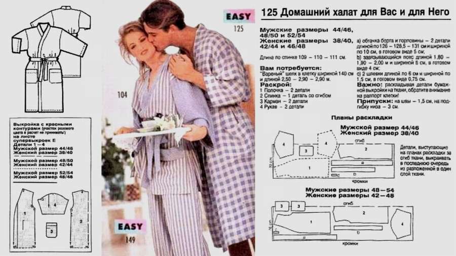 Выкройки женского и мужского халатов с рукавами могут пригодиться молодой паре. Тем более что картинка дается весьма привлекательная. Выкройка взята из журнала мод.