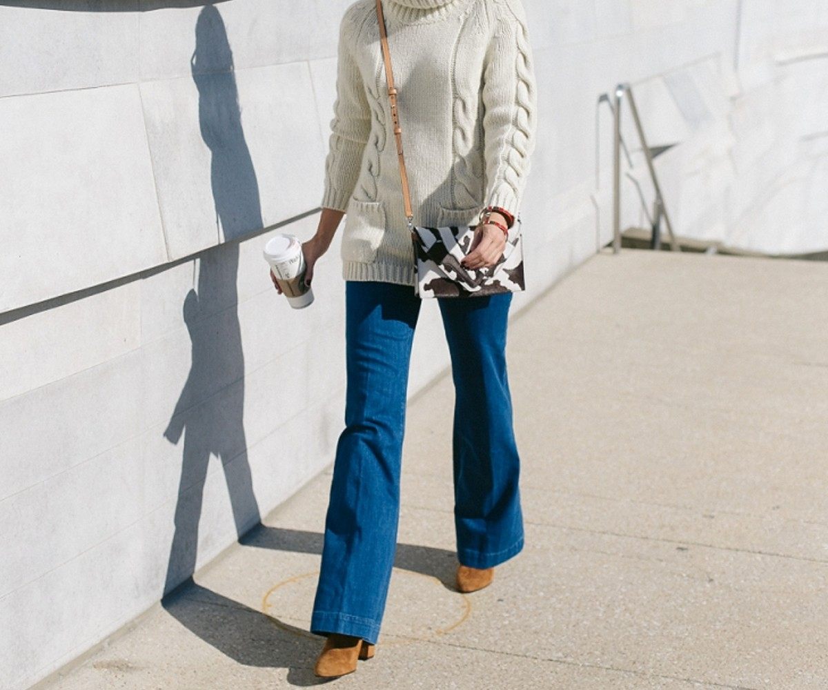 - Не забывайте о том, что в моду возвращаются стильные джинсы клеш. Они прекрасно подходят для тех барышень, которые хотят визуально удлинить ноги. Сочетайте клеши с обувью на платформе, и вы непременно добьетесь желаемого эффекта.
