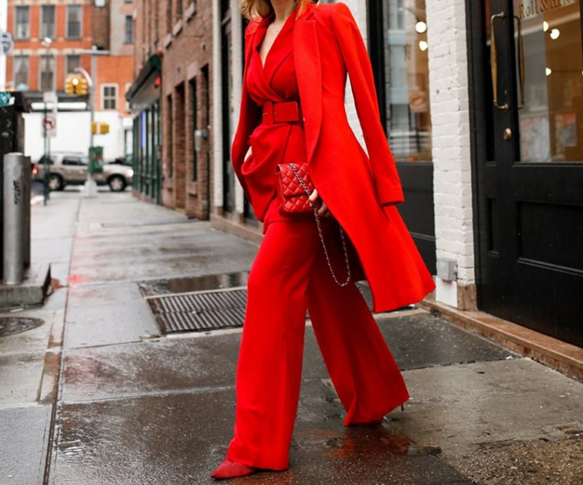 - Найдите место в своем гардеробе для однотонных комплектов одежды. Например, купите красный брючный костюм или черный комбинезон с жакетом в тон.