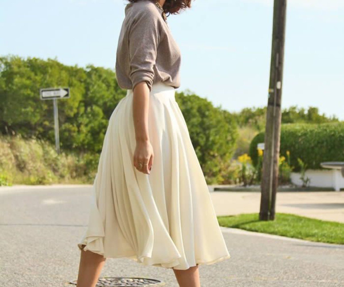 Чтобы лук выглядел максимально «стройным», а ноги казались длиннее, юбка должна заканчиваться в самой узкой части ноги, то есть, находиться чуть выше или ниже колена.