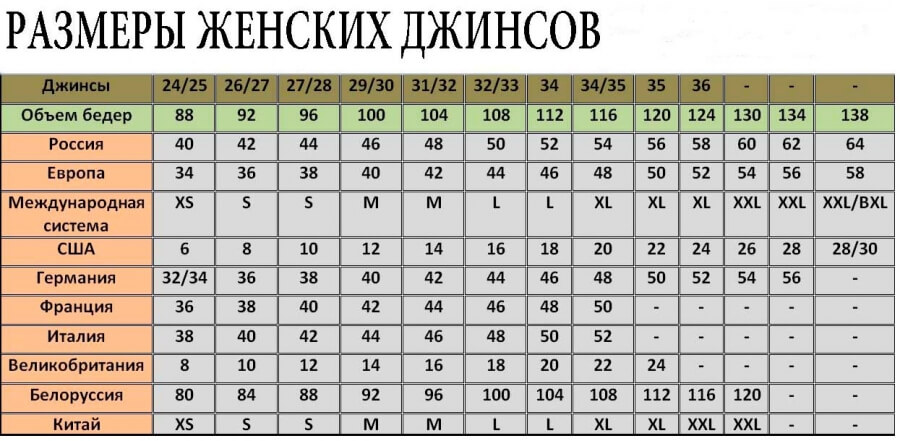 Существенно отличается международная таблица размеров джинсов. Они содержат два обозначения: W (объем талии) и L (длина штанины) после которых стоят цифры-обозначения в дюймах.