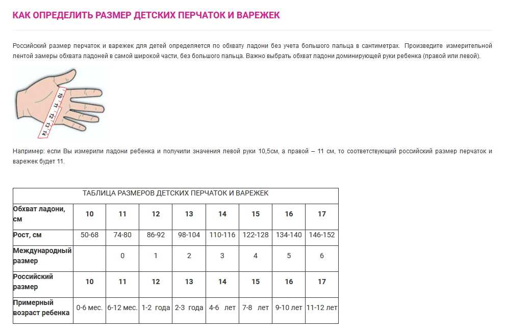 | Уровень возраста | Размер перчаток | Длина перчатки |