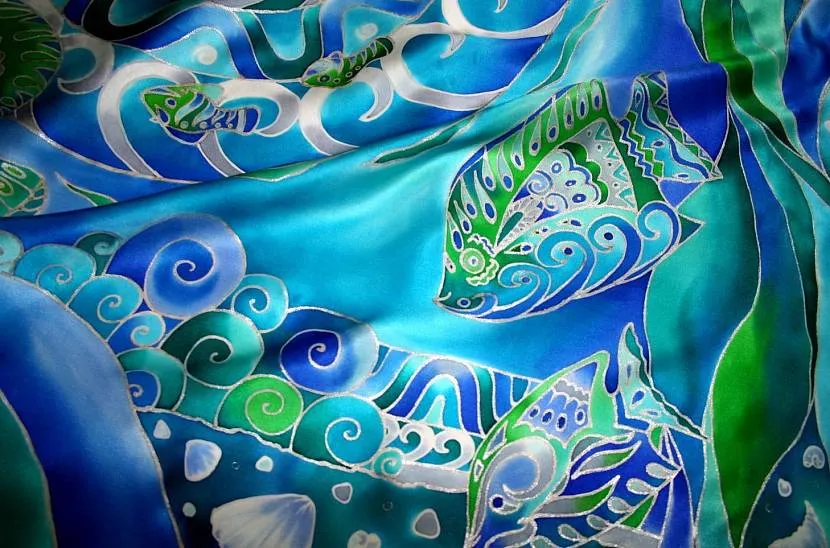 Шелковая ткань, расписанная акриловыми красками в морской тематикеИсточник livemaster.ru