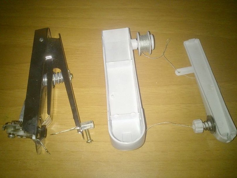 - нитепритягиватель — удлиненный провод, располагающийся на лицевой стороне агрегата, выдергивает нить при образовании стежка;