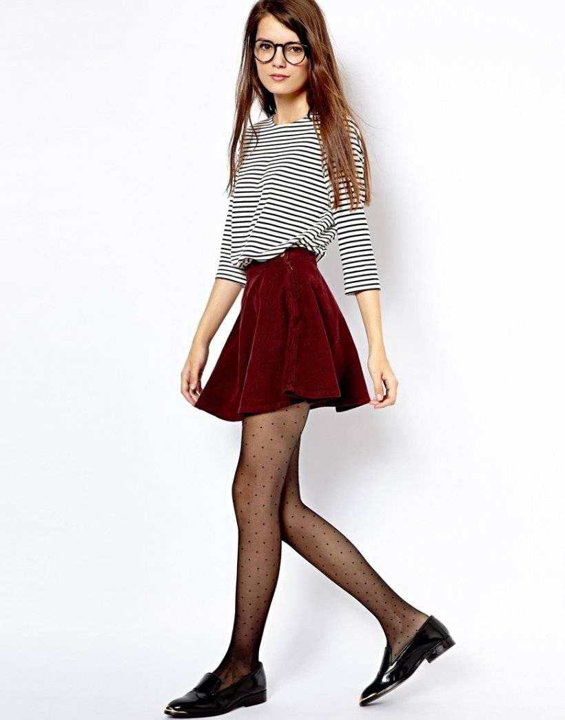 - Плотные колготки яркого цвета, подобранные к юбке, придадут современный вид комплекту;