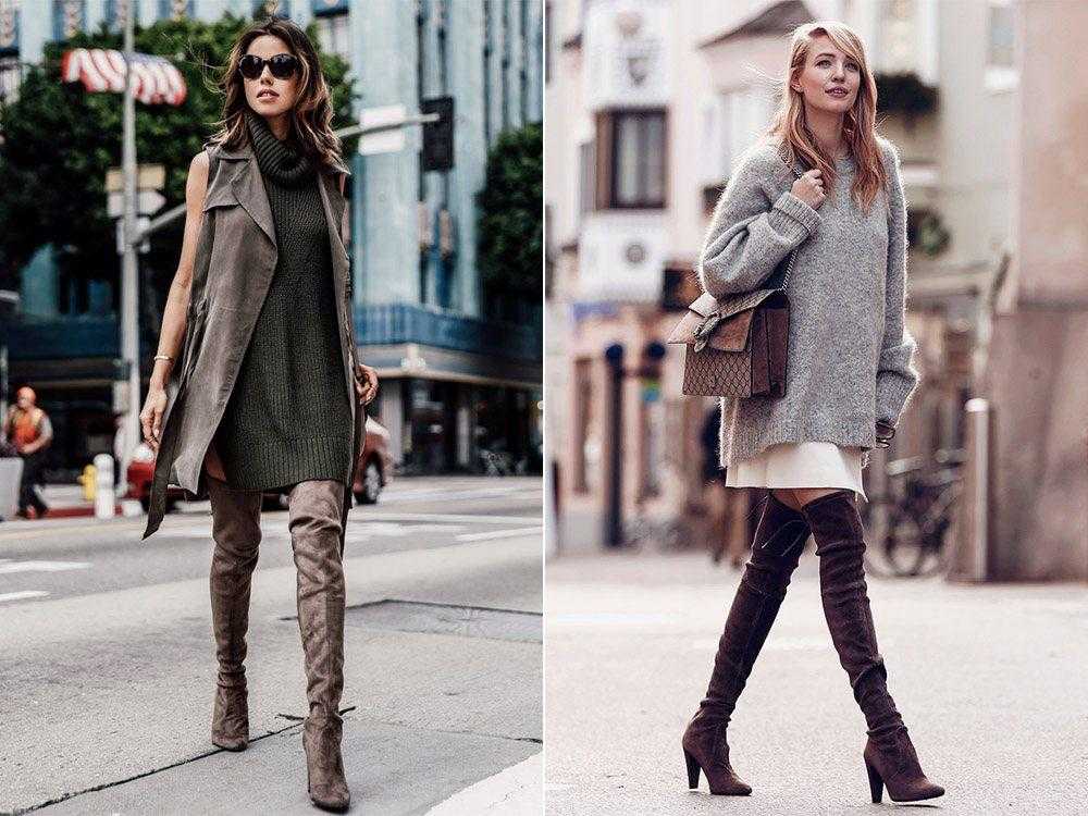 Сочетания могут быть разнообразными: например, совместите кожаные ботфорты с модным платьем-свитером, с джинсами, с классическими бриджами.