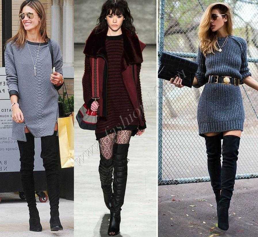 Ботфорты требуют расслабленного силуэта. Бандажные платья, кожаные легинсы, а заодно глубокое декольте – все это удел тех самых «красоток». Женственное закрытое платье, свободное трикотажное платье-свитер будет прекрасным выбором.
