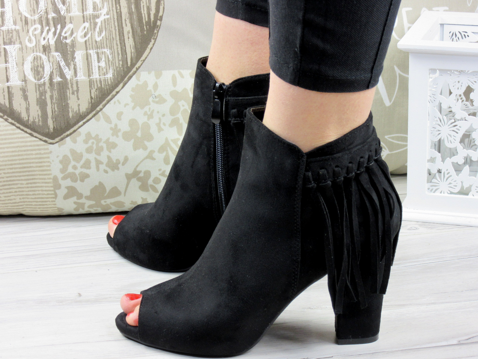 Ботильоны с бахромой подходят к черным кожаным леггинсам и темной блузке с серым свитером. Данная разновидность декора есть и в ковбойском стиле.