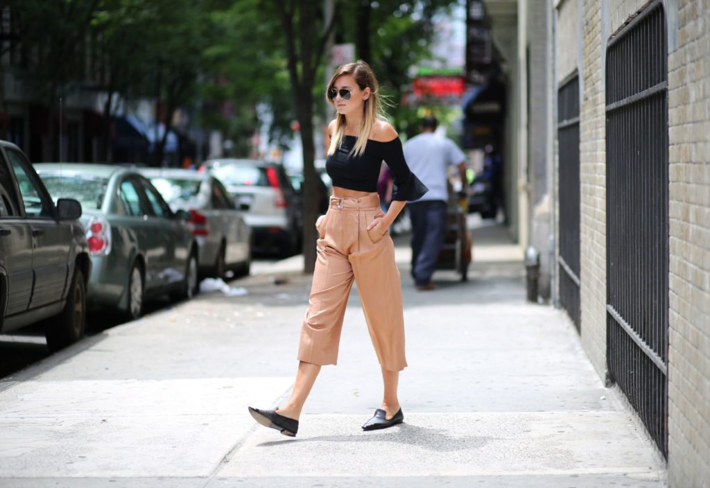 Кюлоты будут выглядеть гораздо интереснее, если подчеркнуть талию. Пусть это будет высокая кокетка, ремешок и блуза облегающего силуэта. Мешковатый верх в паре с просторными брюками кюлотами иногда выглядит немного странно.