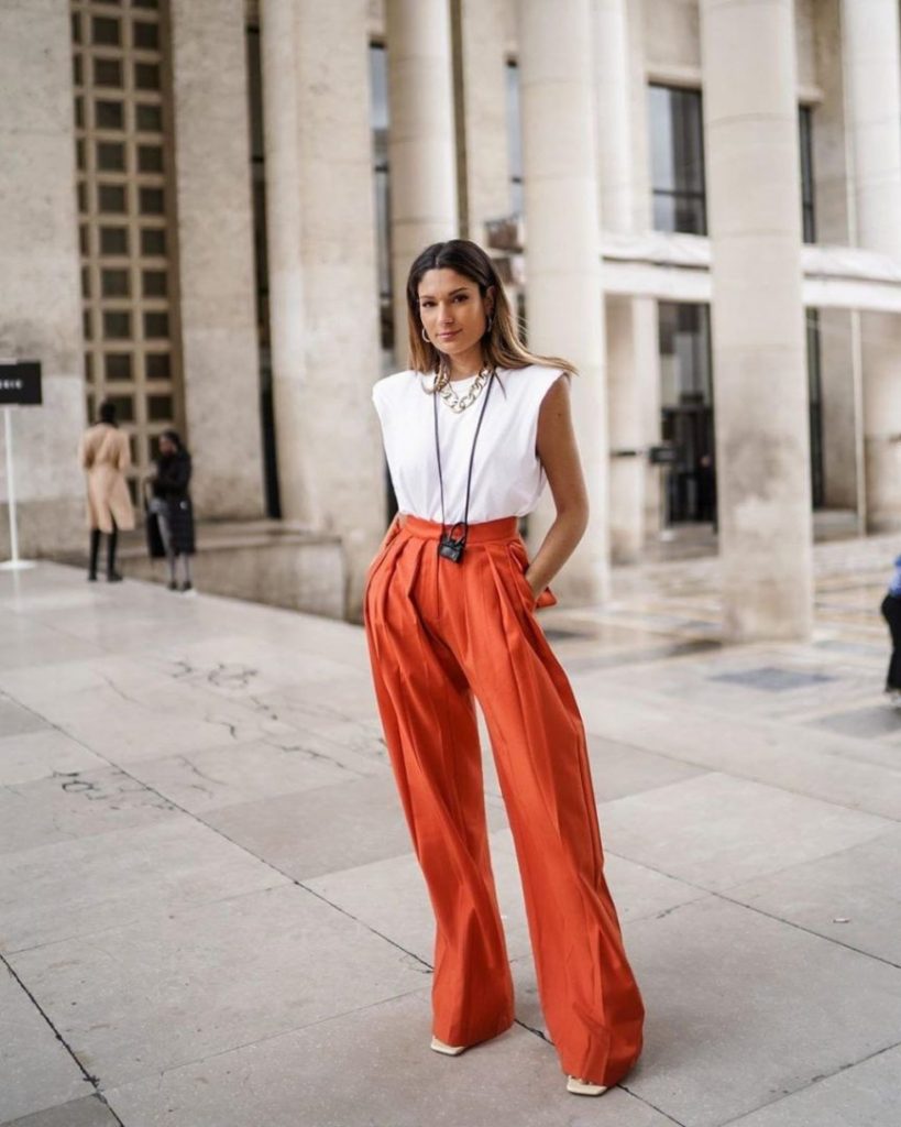 При выборе верхней детали гардероба важно учитывать тот факт, что одежда должна заправляться в брюки или же иметь обтягивающий вид, например короткие топы, не доходящие до пояса брюк. С чем носить палаццо при выборе верха: