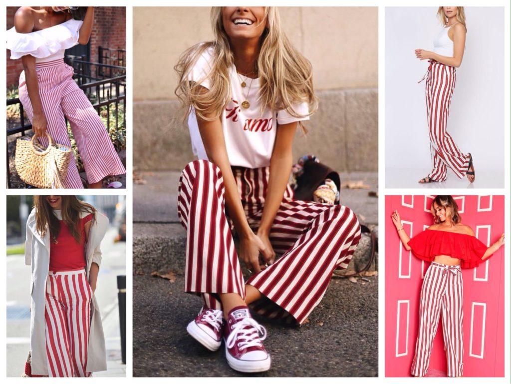 Прорывом летнего сезона станут красные брюки в полоску из хлопка и других натуральных материалов. Брюки с белой полоской выглядят ярко и позитивно. Стилисты уверены, что уже скоро они появятся на деловых леди и женщинах старшего возраста.