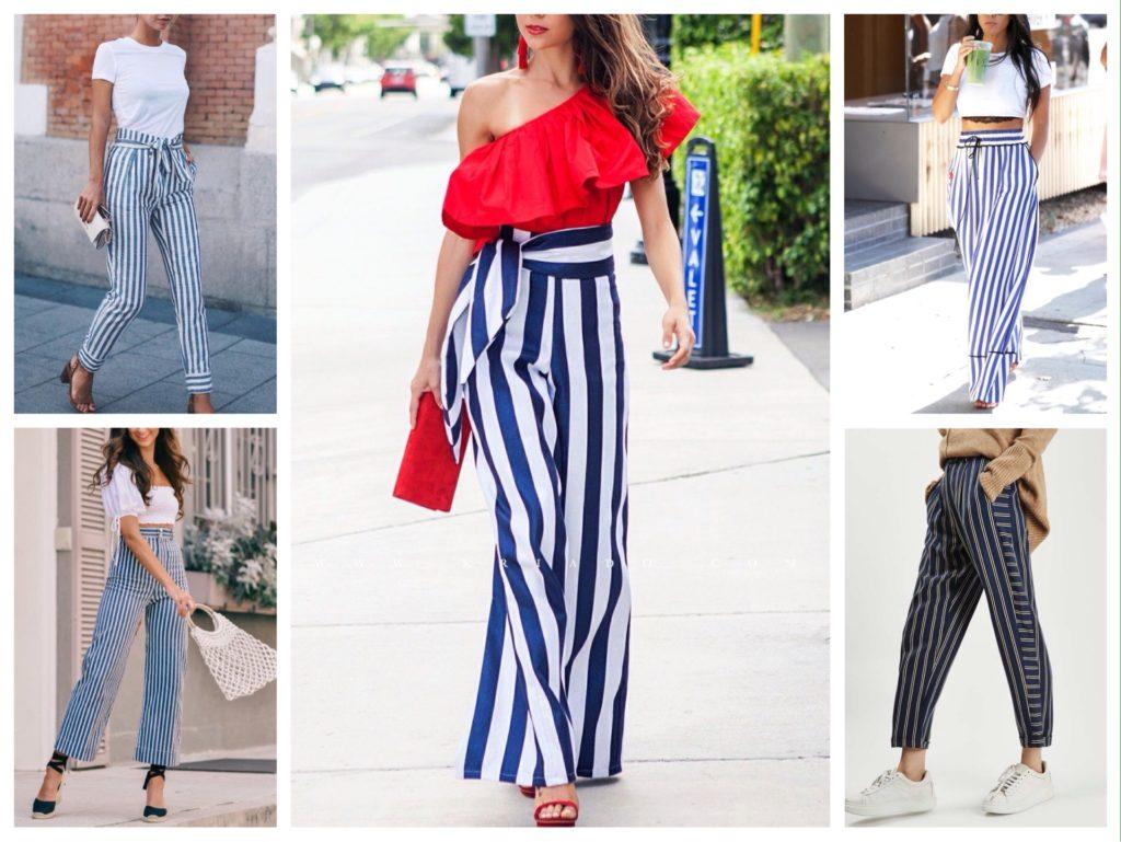 Такая одежда ассоциируется с морским стилем, но будет актуальной и при составлении повседневного или делового аутфита. Зауженные синие брюки в полоску, модели с высокой талией и кюлоты освежат внешний вид, сделают ножки визуально длиннее и стройнее.