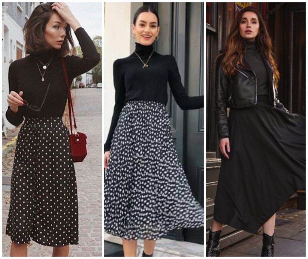 Несколько десятилетий назад модницы надевали черные водолазки «в рубчик» с короткими фактурными юбками. И сейчас весьма интересным вариантом сочетания являются бархатные или велюровые яркие юбки А-образного силуэта.
