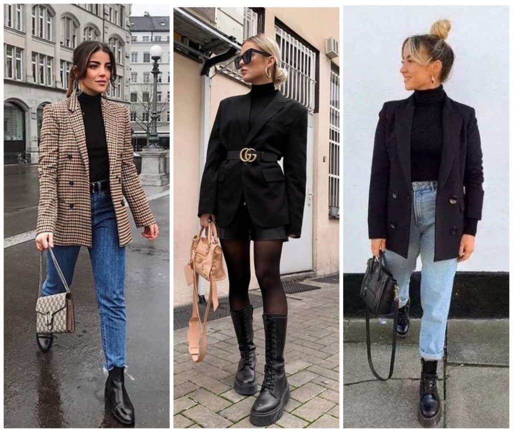 Удобно, но с классом – это в стиле кэжуал. Облегающая бесшовная черная водолазка в сочетании с джинсами бойфренда с высокой талией. Свободные штанины закатайте так, чтобы они доходили прямо до лодыжки. Комплект дополните блейзером – длинным, похожим на мужской.