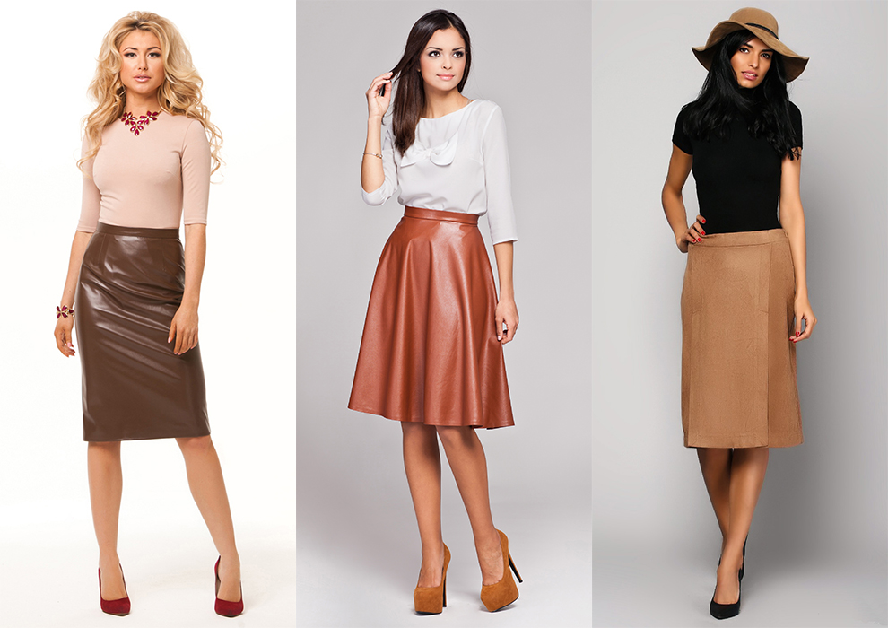 Кожаная юбка-карандаш бежевого цвета хорошо комбинируется с белым, черным и бежевым верхом. Здесь допустимо подбирать верх с декором или из вязаного материала. Аксессуары можно подбирать в тон юбке, а украшения золотого оттенка. Если выбираете верх темного цвета, то цвет обуви должен ему соответствовать.