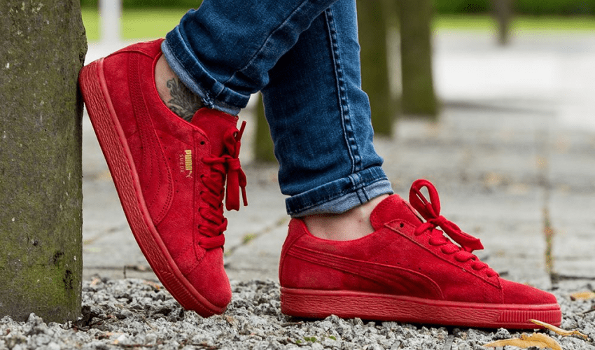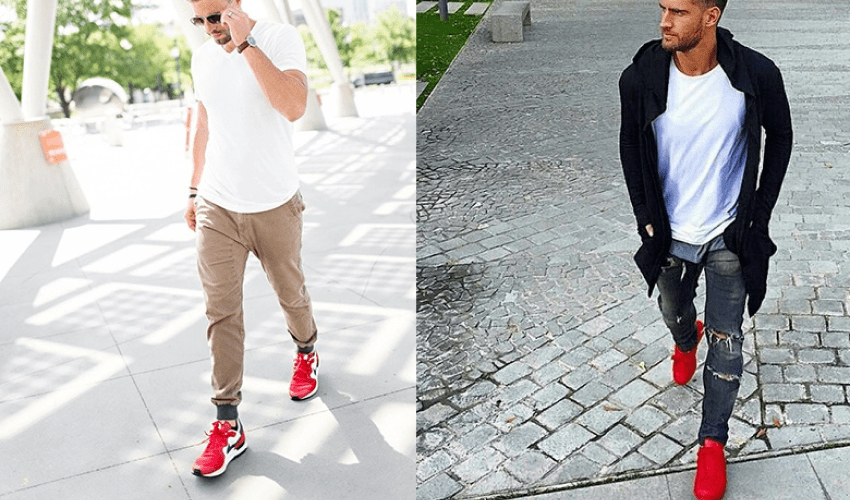 Оптимальный дуэт с красными кроссовками для женщин и мужчин. Лучше отдать предпочтение классическому индиго. Когда-то все джинсы были только такого цвета. Но можно сочетать красную обувь с голубыми, темно-синими или черными брюками.