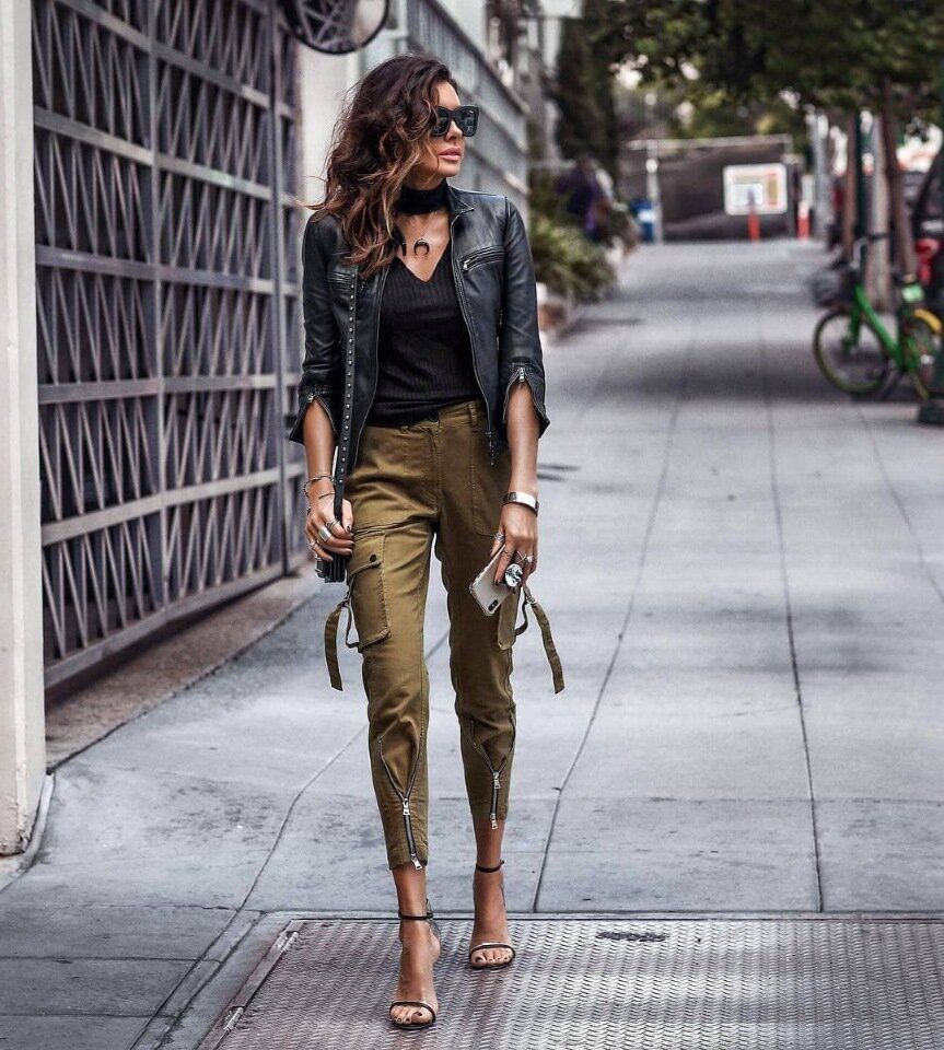 К кожаной куртке подойдут брюки любого покроя. Очень эффектно смотрятся брюки из кожи с курткой. Прекрасное сочетание можно создать из косухи и кюлот из эко кожи. Помимо этого девушка с хорошей фигурой будет выглядеть выигрышно в узких брюках и зимней короткой куртке.