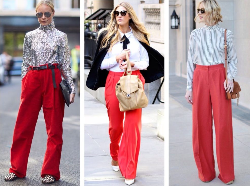 В красном цвете и его оттенках шьют скинни, палаццо, бананы, кюлоты, клёш от талии, бедра, колена. Силуэт брюк должен подчёркивать достоинства фигуры, ткань — соответствовать времени года, и главное — брюки должны нравиться своей обладательнице. Обладательницам пышных форм советуют носить широкие брюки из струящихся тканей. Они подчеркнут достоинства и скроют недостатки.