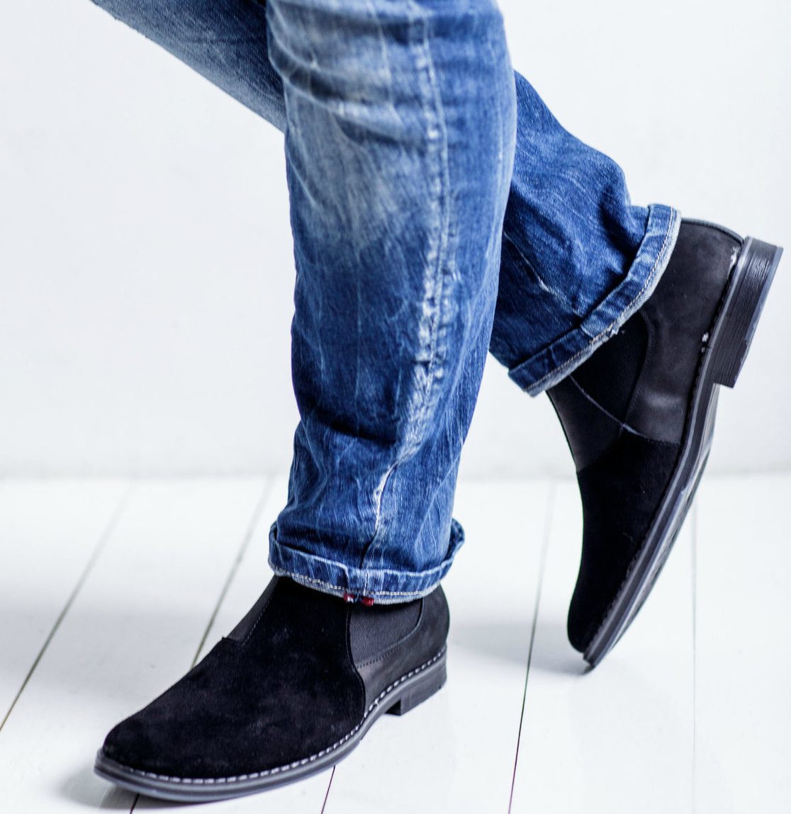 Широкие джинсы или прямой, свободный крой брюк с челси не надеваются. Если ботинки замшевые, то низ джинсов можно собрать гармошкой сверху или слегка их подвернуть. Мужчины носят эту модель, закрывая верх обуви или чуть-чуть приоткрывая, но только самую капельку. Штанины в обувь не заправляются. Брюки тоже подходят зауженные, со стрелками или без них, в облипку, можно носить челси с чиносами.