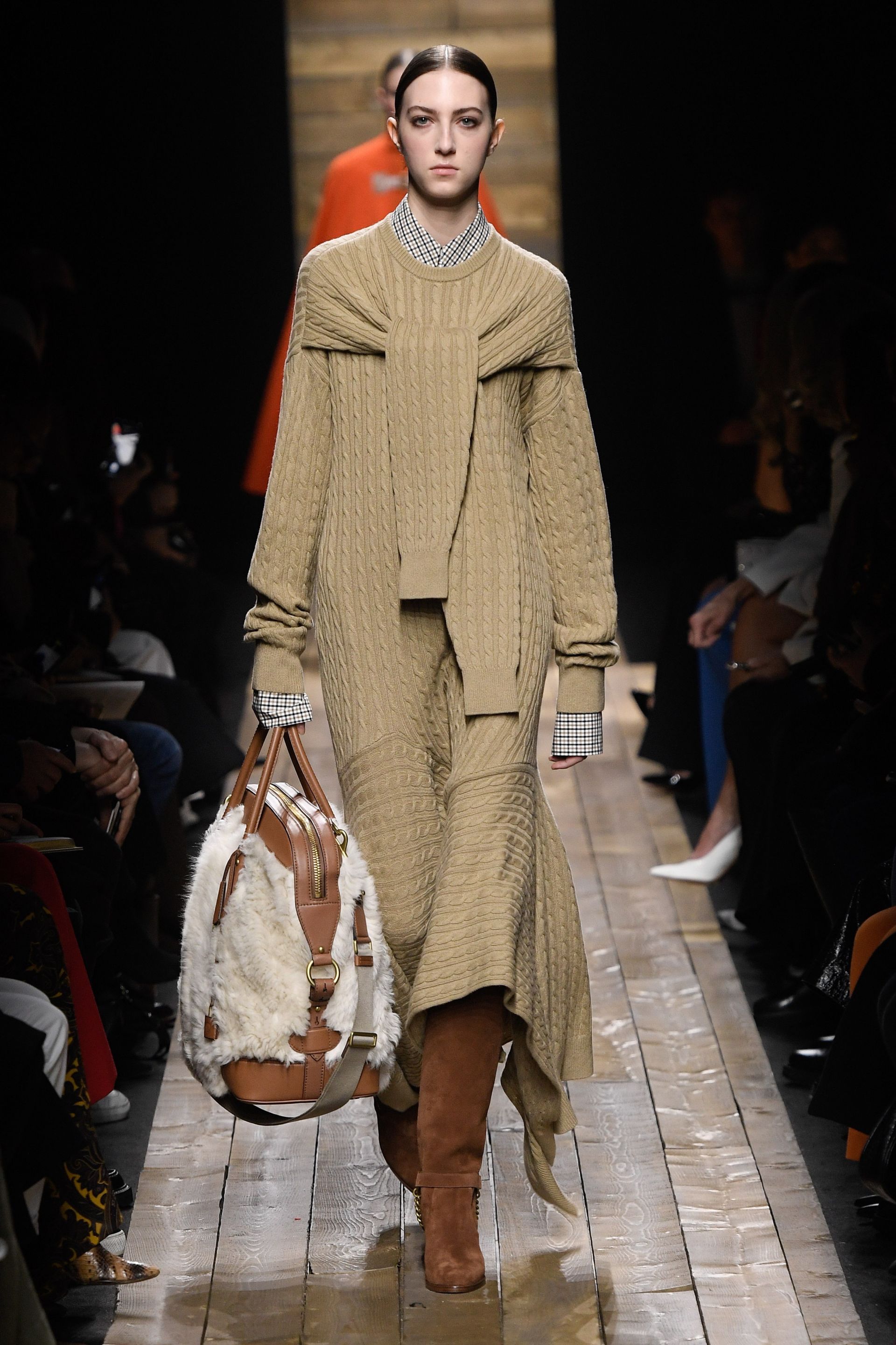 На примере модного показа мы видим, что такое платье можно носить с рубашкой с принтом, однако если вы не хотите перегрузить и без того сложное платье-свитер, носите его без лишней одежды и аксессуаров. Платье-свитер бежевого цвета идеально сочетается с контрастной обувью: это могут быть как темно-коричневые сапоги-казаки, так и красные ботфорты или грубые ботинки (лучшую альтернативу привычной осенней обуви ищите здесь).
