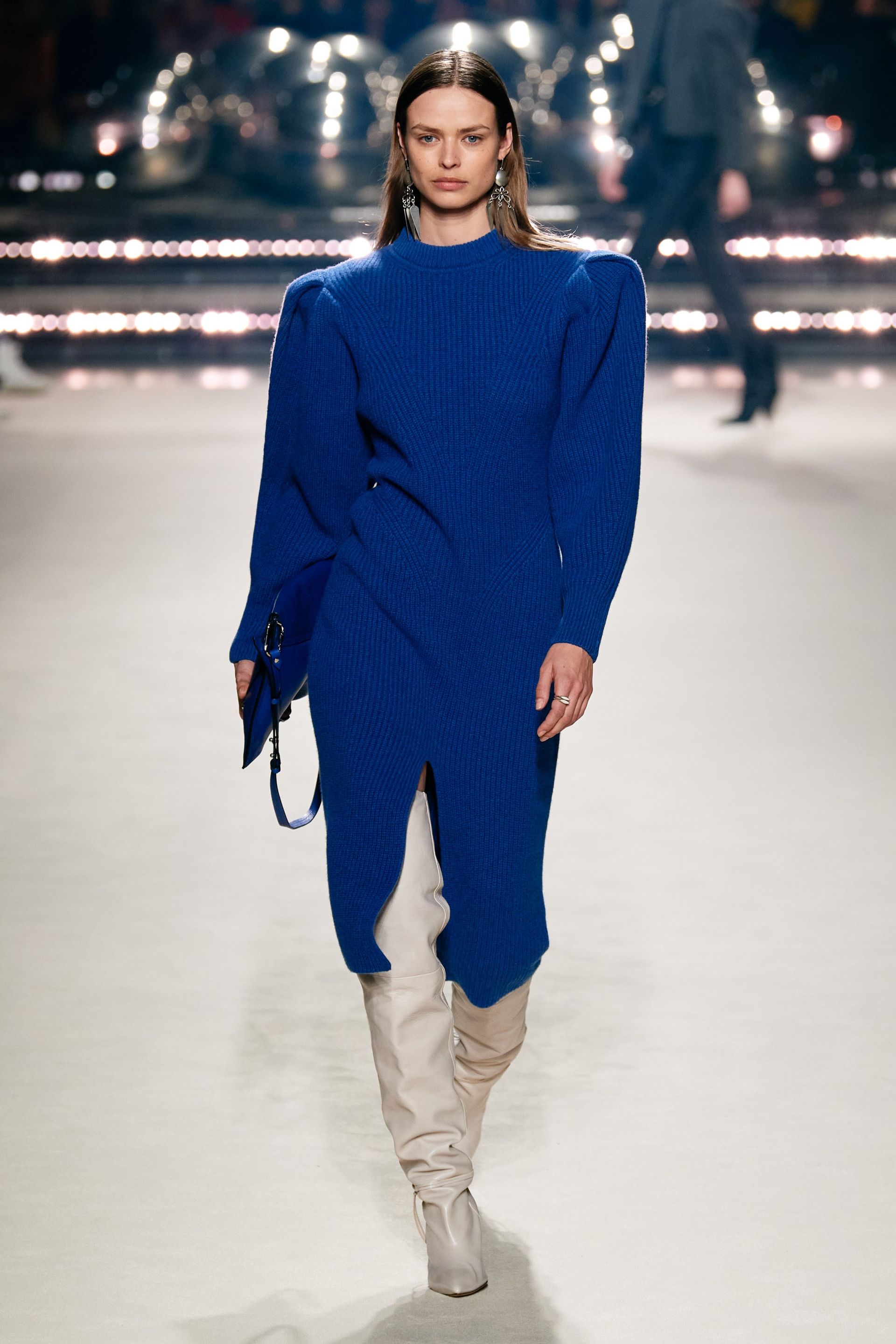 Насыщенный цвет платья позволяет выбирать менее броские оттенки обуви и аксессуаров. Дизайнеры предложили носить такое платье-свитер вместе с высокими белыми ботфортами – это именно тот случай, когда образ с подиума можно повторить на все сто процентов. Массивные аксессуары и сумка в тон идеально дополнят образ и расставят правильные акценты.