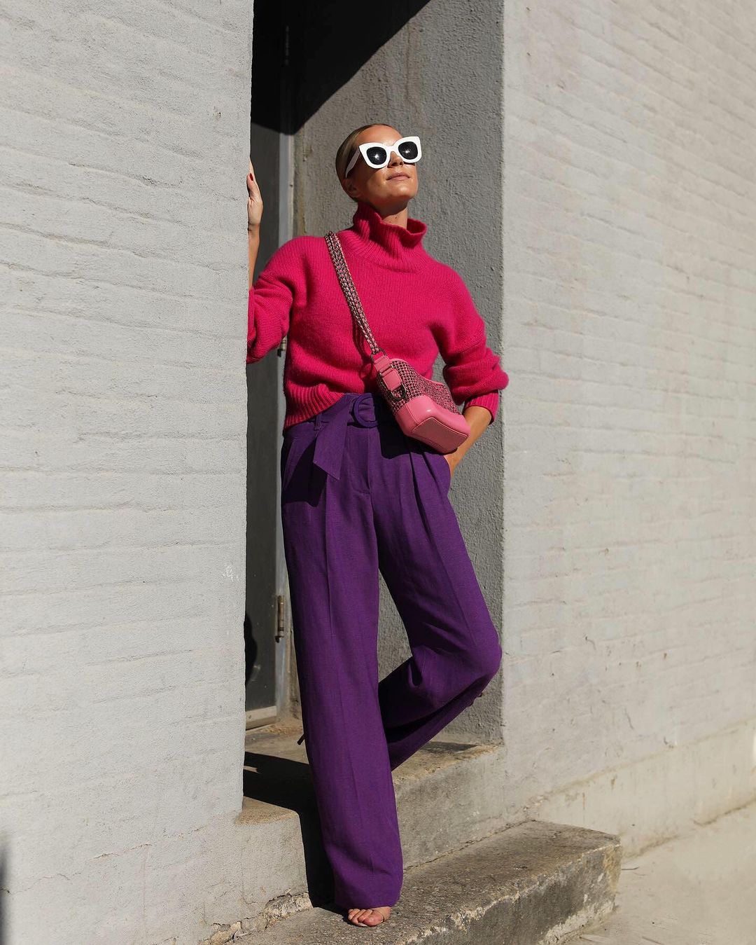 - Желаете создать образ для выхода в театр, кино или просто для прогулок по городу? Значит, надевайте свитер цвета фуксии вместе с черными брюками.