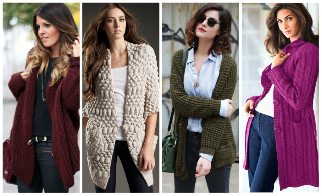 Кардиган – вязаная кофта без воротника длиной до середины бедра, в моде удлиненные виды этой одежды со свободно свисающими полами пастельных, розовых, голубых и желтых оттенков. Они могут быть объемными, тонкими кружевными, с застежкой или без нее, разного силуэта. Часто женские жакеты декорируют меховыми карманами, вышивкой, этническими элементами. Их можно носить свободными или подчеркнуть талию при помощи тонкого ремешка.