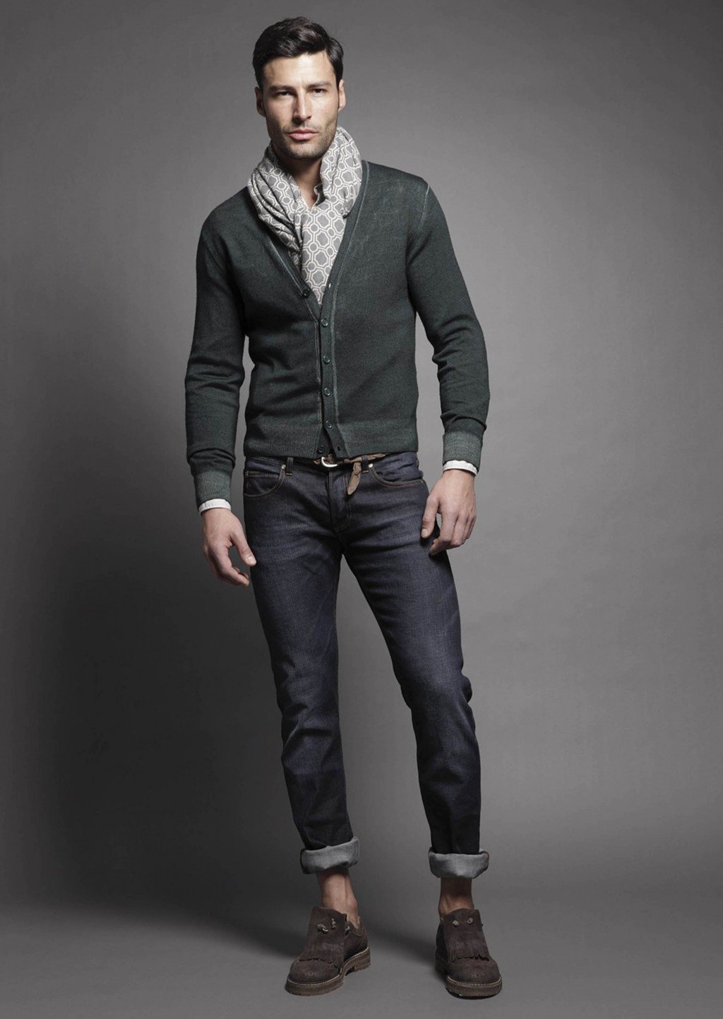 Мужские жакеты носятся с джинсами, классическими брюками. Дополняют их рубашками, свитерами. Обувь подойдет любая.