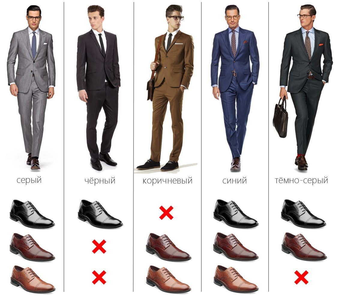 Важно помнить, что цвет обуви должен сочетаться с цветом костюма. Классический выбор — черные или коричневые туфли