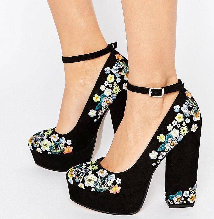 - покупайте туфли с мелким рисунком на скрытой платформе. Это может быть мелкий принт в виде крошечных цветочков, декоративная вышивка и множество других мелких элементов из бисера, цветного песка и пр. Отлично подходят для девушек с тонкими ножками туфли, подошва которых имеет узкую вертикальную или диагональные полосы.