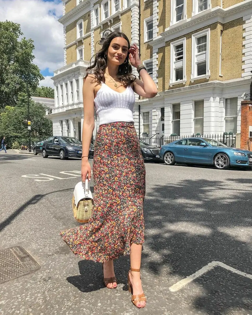 Юбки средней длины сегодня невероятно актуальны, особенно из ткани с ярким цветочным принтом. Подбирая верх, нужно следить за пропорциями фигуры, есть риск укоротить ноги. В костюме с такой юбкой талия должна быть акцентирована и должна находиться на естественном уровне или чуть выше. Красиво смотрятся юбки миди с заправленной блузкой или рубашкой завязанной на талии узлом. К летним вариантам можно подобрать элегантную маечку или модный кроп-топ.