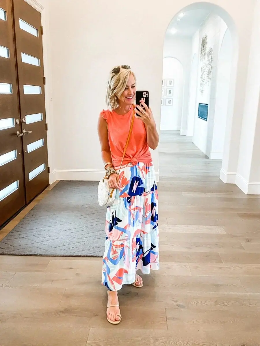 Для создания выходного образа с юбкой с цветочным принтом можно выбрать простую блузу или топ одного из цветов принта. Чтобы добавить немного элегантности, можно выбрать блузу с кружевными или прозрачными деталями. Такой комплект можно дополнить туфлями на невысоком каблуке и небольшой сумкой в тон.