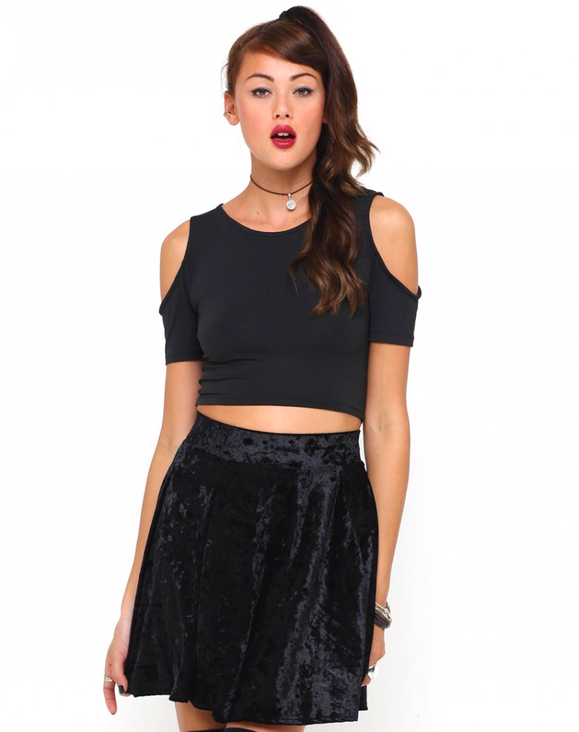 Черный топ с глубоким декольте — это классический и сексуальный вариант, который подойдет для создания элегантного и вызывающего образа. Черный цвет прекрасно сочетается с велюровой юбкой любого тона и создает загадочность и привлекательность.