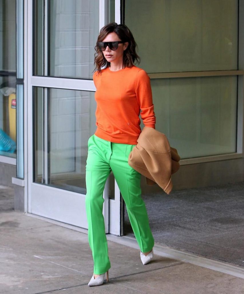 - Калоритные кислотные цвета – для дам «вешнего» типа наружности. Непревзойденно «соседствуют» с таковыми насыщенными оттенками, как красноватый, чёрный, оранжевый. Не сумеют «дружить» с пастельными цветами – образ получится неустойчивым, тяжёлым.