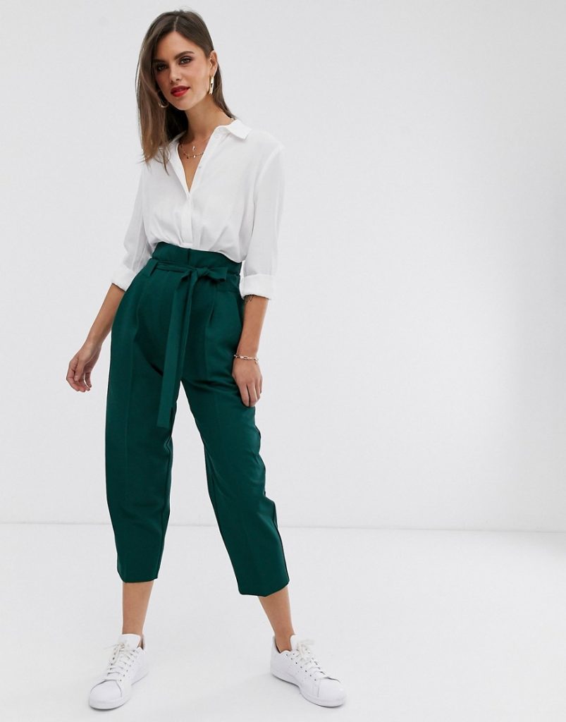 Выбирая брюки с завышенной талией, невозможно прогадать. Такие модели будут идеально смотреться на любой девушке и обязаны быть в гардеробе каждой модницы. Учитывая нейтральные зеленые тона, модель с завышенной талией будет смотреться актуально для неформальных встреч, деловых мероприятий. Даже для серьезных торжеств или офисного дресс-кода фасон прекрасно подойдет. В этом случае выбирать верх стоит в зависимости от того, какой повод для такого наряда. Лучше всего присмотреться к темным тонам.