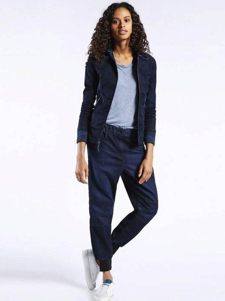 Насыщенный синий подойдет для более прохладного времени года. Именно темно-синие бананы сочетаются с майками-тельняшками и топами ярких оттенков.