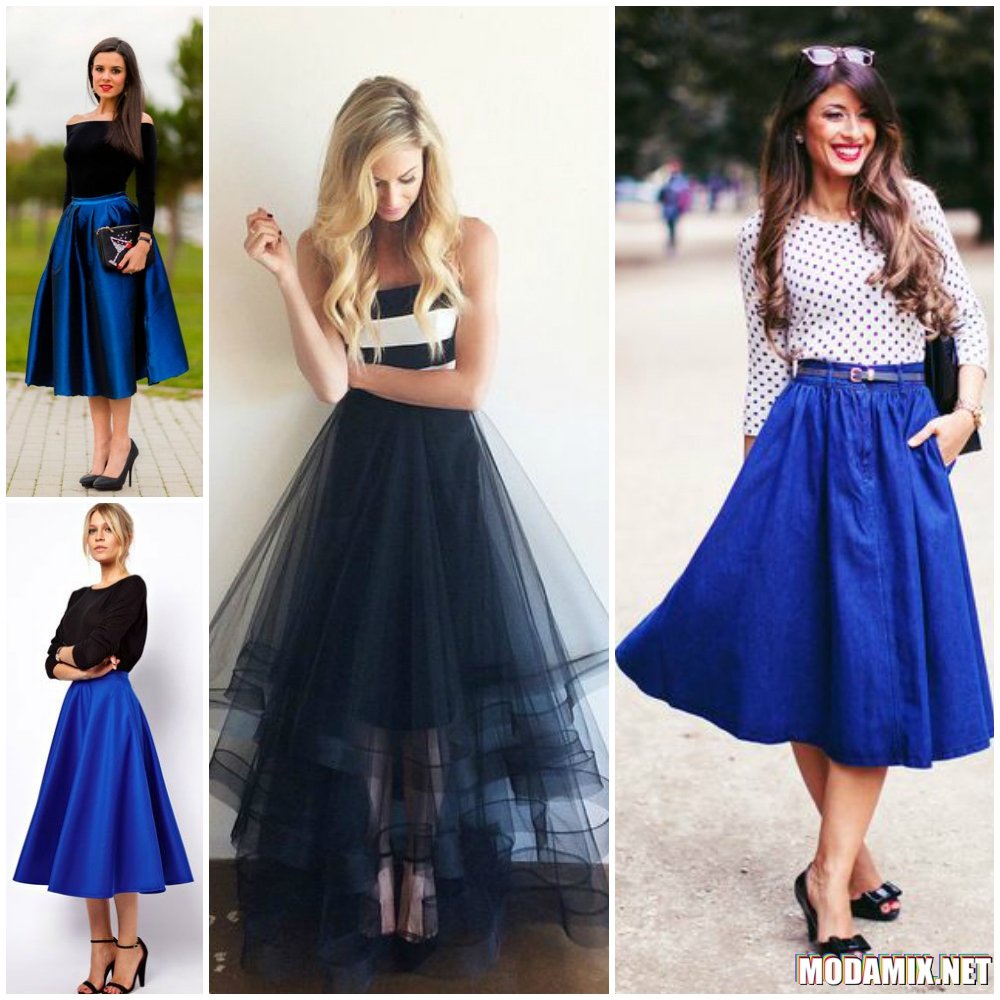 Вот несколько идей, с чем можно носить синюю юбку клеш длинную:
