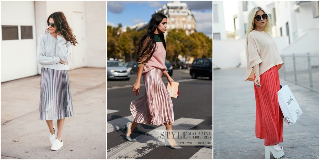 Благодаря демократичности сегодняшней моды, варианты создания комплектов с юбкой плиссе безграничны. Если раньше в классическом варианте такую юбку носили, в основном, только с блузкой, то сегодня можно позволить себе сочетать несочетаемое и выглядеть при этом стильно и оригинально.