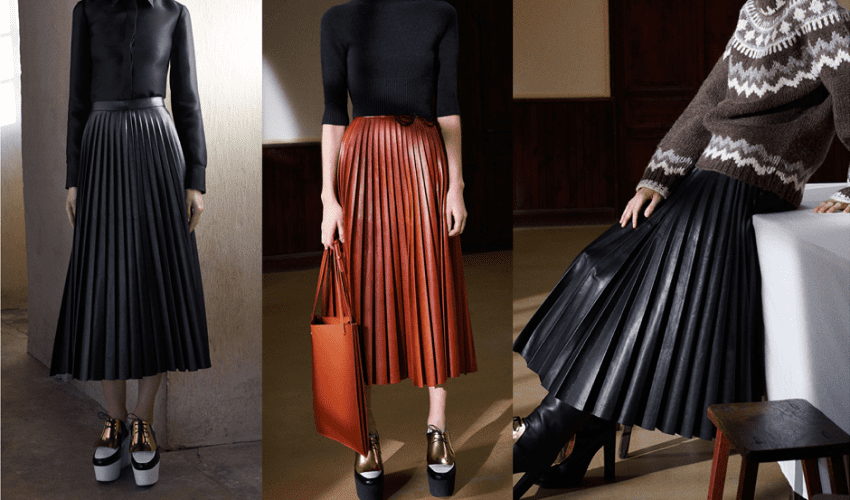 Кожаные юбки-плиссе можно сочетать с водолазками, вязаными кардиганами, меховыми жилетами, короткими куртками или пальто по типу оверсайз. Из обуви особенно интересно будут смотреться замшевые высокие сапоги.
