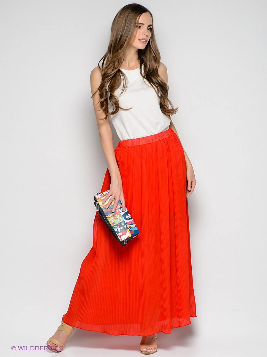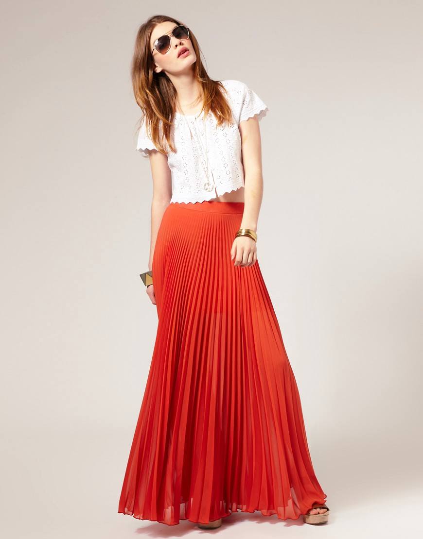 - Летом, в жаркий период для прогулок по городу или шопинга рекомендовано сочетание макси юбки плиссе с футболкой или открытым топом. Это могут быть модели из кружева, трикотажные лаконичные топы, открывающие живот. Дополнить образ можно оригинальными украшениями на шею и клатчем в тон юбки. Из обуви для такого образа подойдут кеды белого либо пастельного оттенка.
