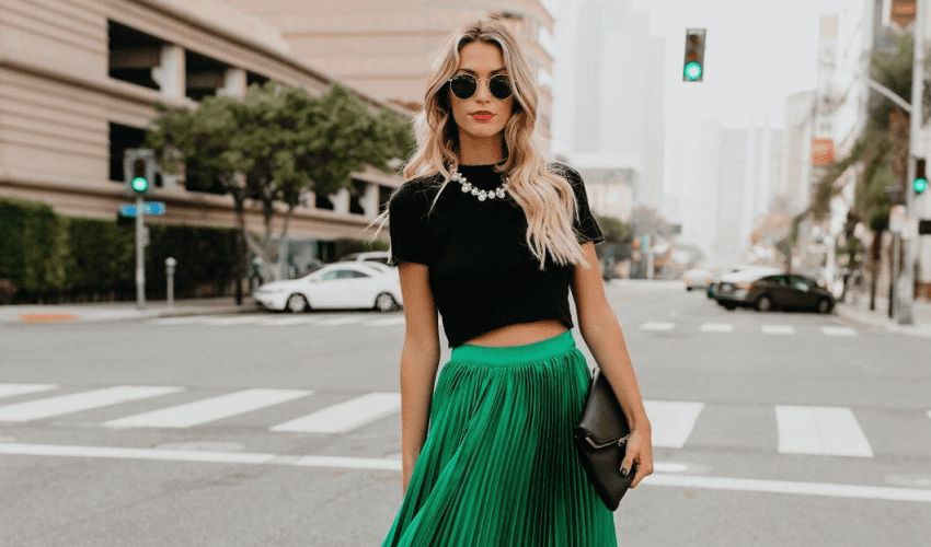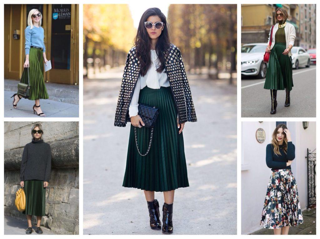 - зеленая палитра плиссе, сочетается с монохромными свитерами, топами из кружева свободного кроя и аксессуарами коричневого цвета;