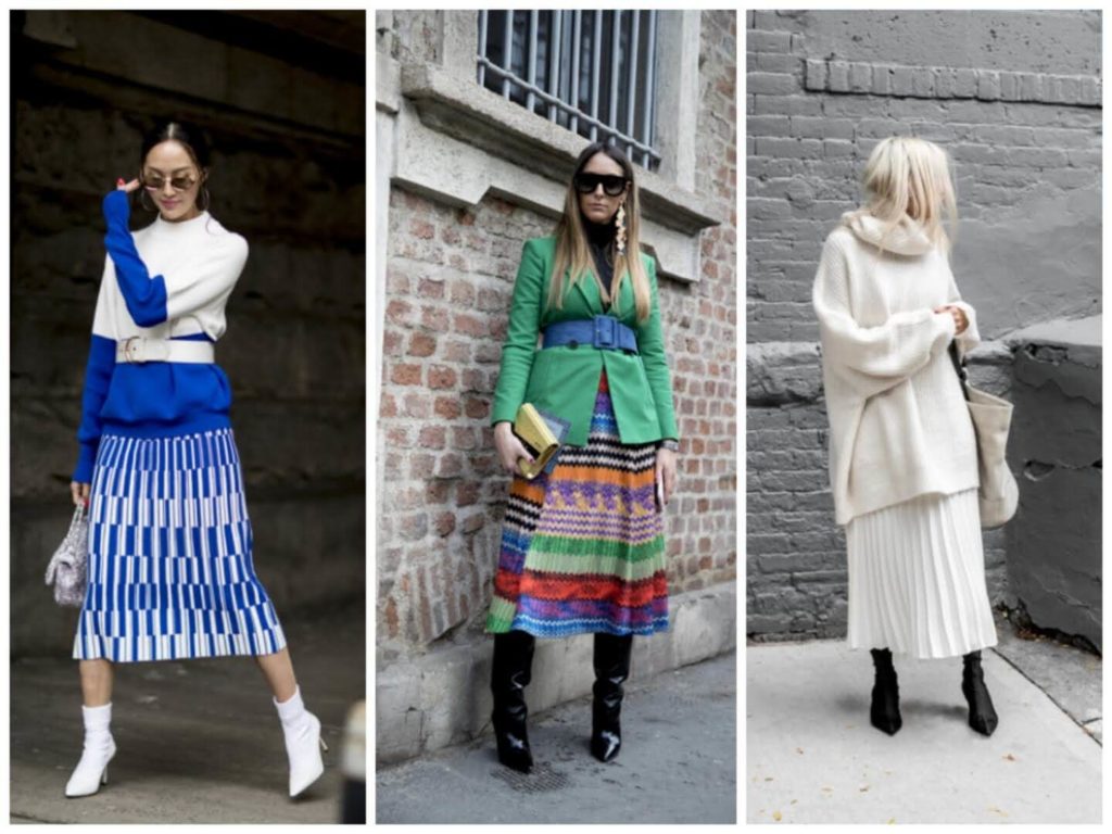 В этом сезоне юбки с такой длиной можно часто встретить и в зимних коллекциях многих известных модельных домов, там они встречаются в утепленных вариантах из парчи и бархата. Обязательное условие тренда этой осени — это дополнение юбки свитером-топом либо пуловером, который нужно заправлять в юбку, можно даже не полностью.